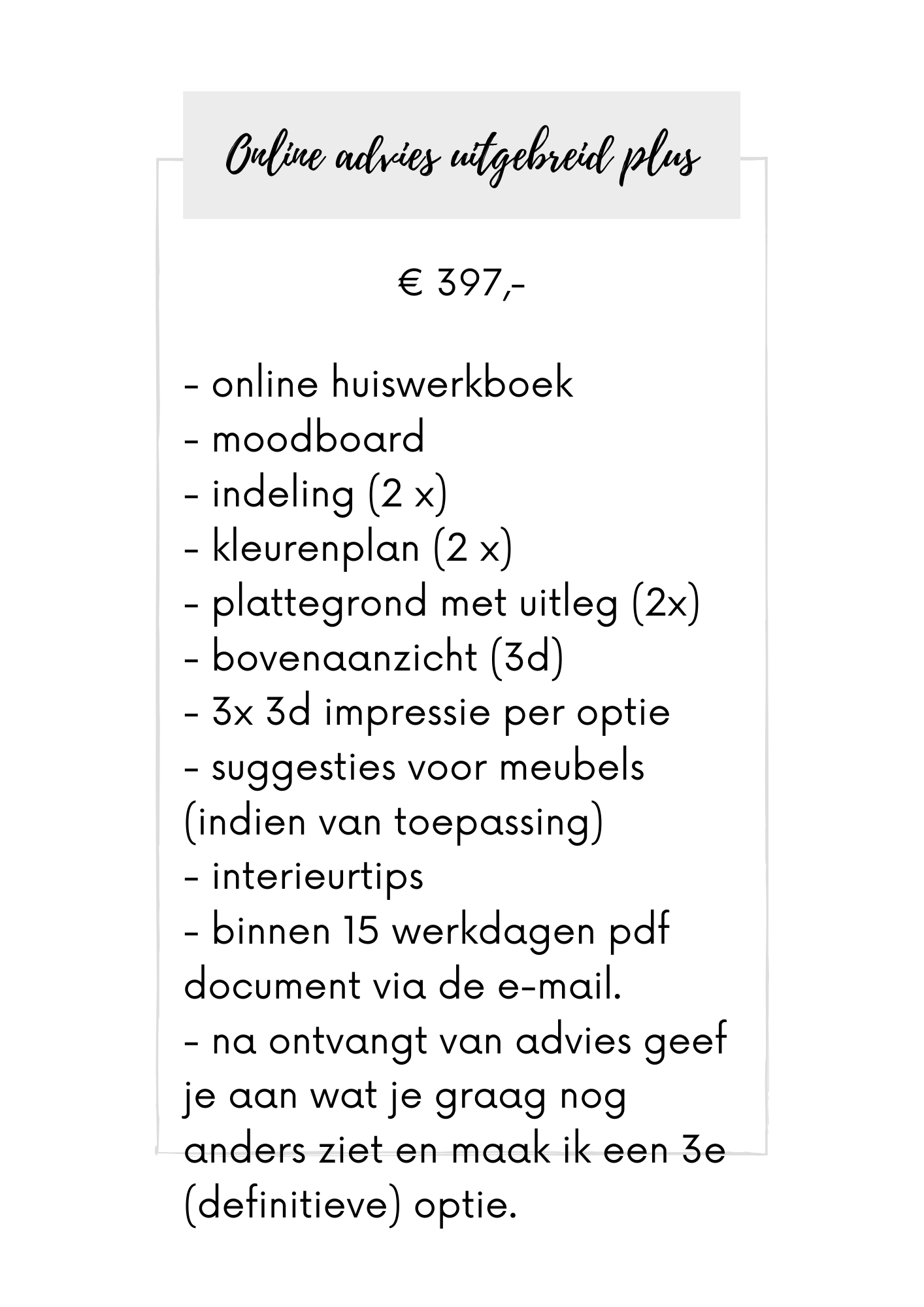Wil je nog net iets extra’s dan het uitgebreide interieuradvies, na de 2 opties nog aangeven wat je graag anders ziet? Dan is het online uitgebreid interieuradvies plus voor jou.